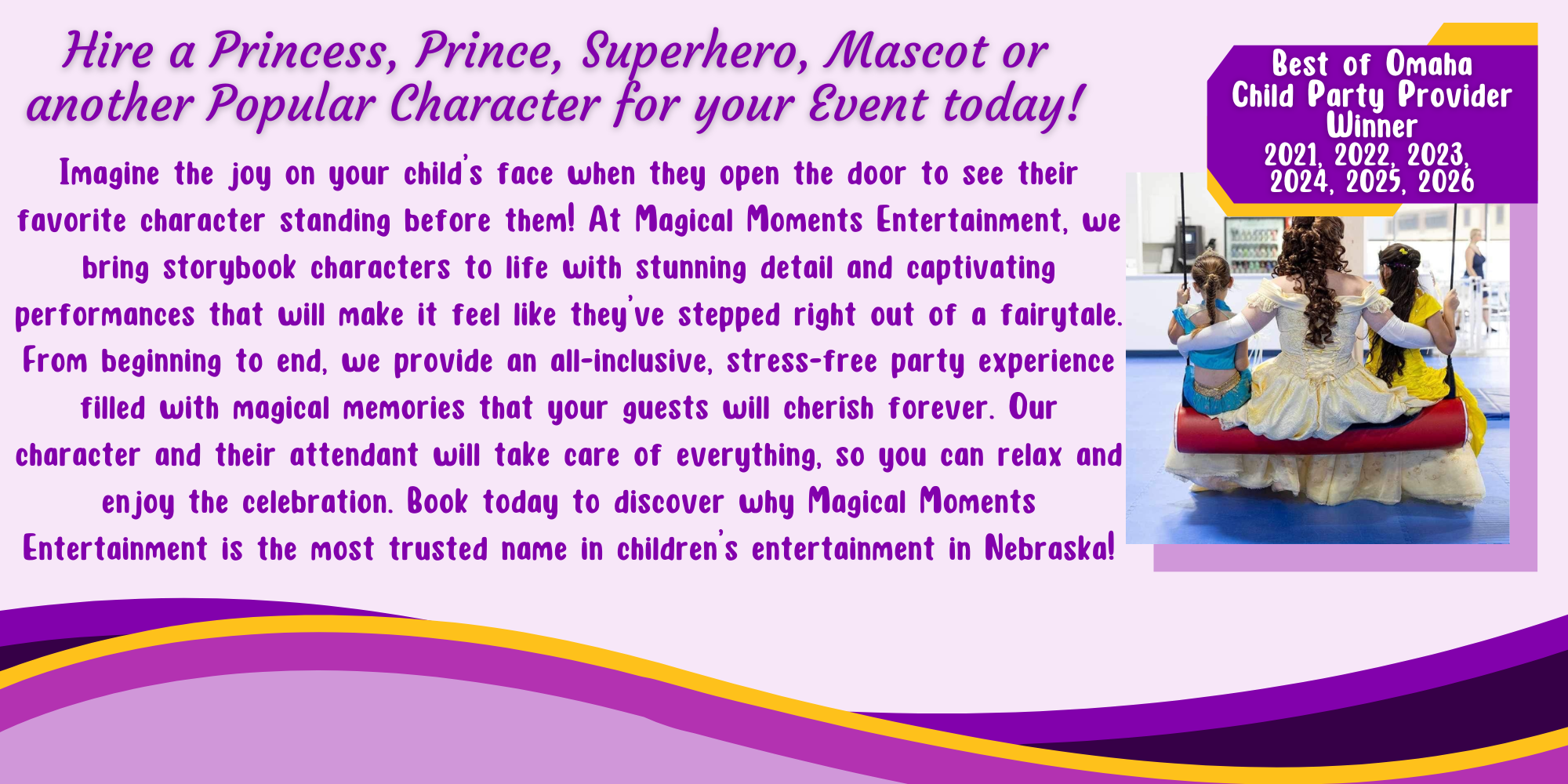 Looking to make your next event a bit more magical? We’ve got you covered! As Nebraska’s #1 Children’s Entertainment Company, Magical Moments Entertainment will bring the theme park quality magic to you!