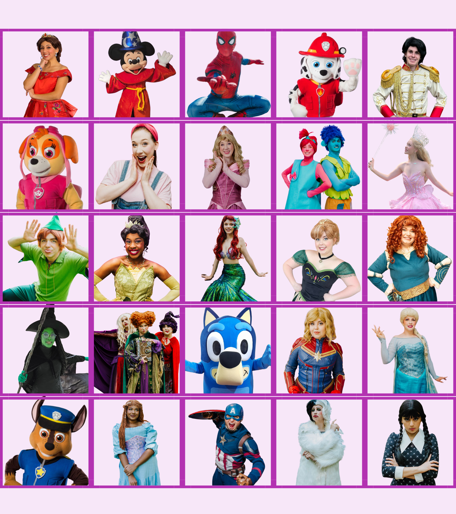Offering a variety of Princess, Prince, Superhero and other popular characters for your events!