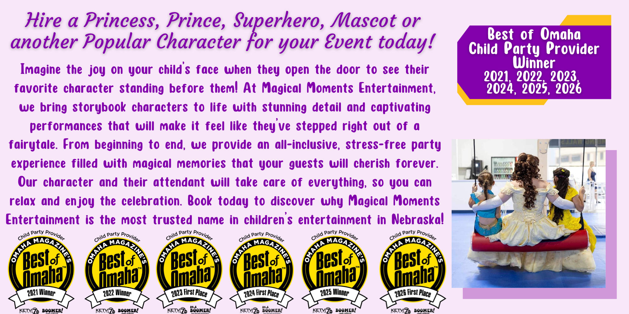Looking to make your next event a bit more magical? We’ve got you covered! As Nebraska’s #1 Children’s Entertainment Company, Magical Moments Entertainment will bring the theme park quality magic to you!